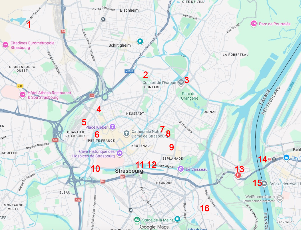 Architour Strasbourg pour Blandine & Ulrich Plan 1-Espace Européen de l'Entreprise 2-Palais des Congrès 3-Parlement etc 4-Boulevard Wilson 4-Parking Wilson P3 4-École d'architecture 5-Gare 6-Musée d'art moderne 7-Nouveau planétarium 8-Studium 9-Fac de médecine 10-Mosquée 11-Cité de la Musique et Danse 11-Cité "bonbon" 12-Tour Elitis 13-Rue François Epailly 14-Pont Beatus Rhenanus 15-Passerelle Mimram 16-Rue de Soultz 6